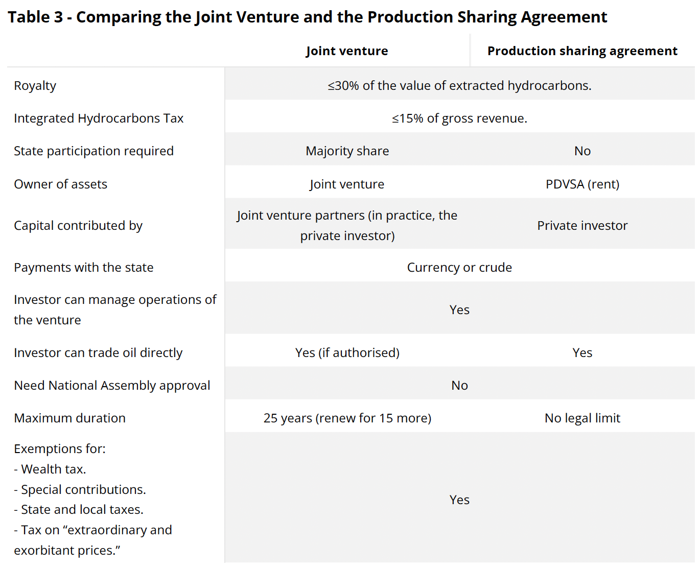 The Reform has brought the two frameworks closer together, although the CPP remains considerably more attractive to investment. The main concern is that, in practice, in both cases the investor must make all capital commitments, but in the joint venture, PDVSA is still holds a majority of shares.