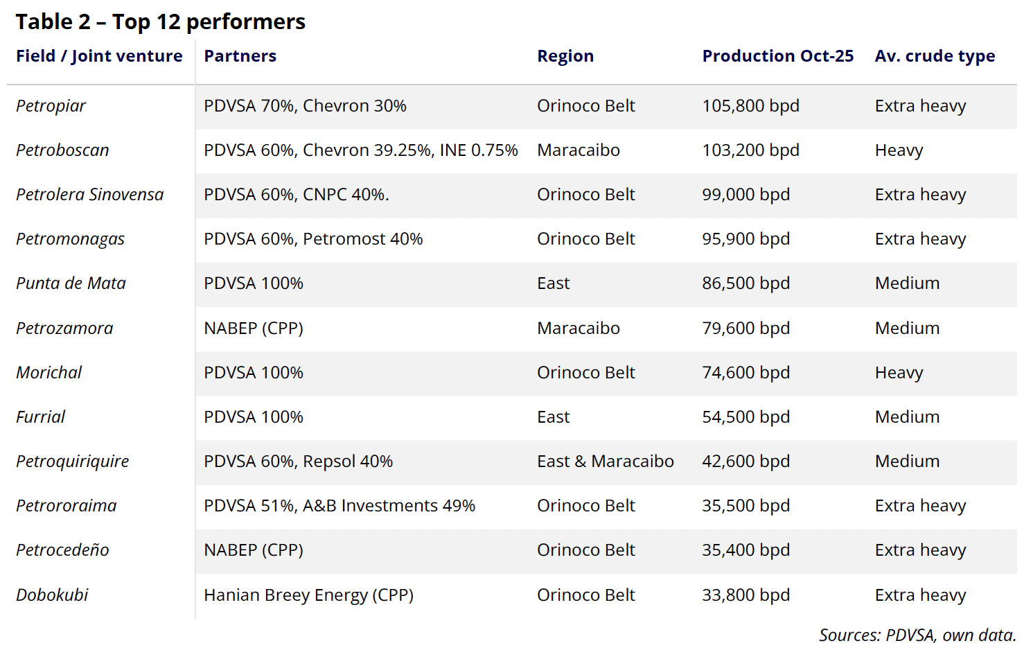 Table 4 shows a list of brownfield projects where output was revamped quickly even within a high-risk, restricted framework. The selected period starts with the introduction of U.S. Treasury licenses under the Biden administration and ends with their rollback during Trump’s second term. With reforms in Caracas and an easing of sanctions from Washington, DC, the contracts used here could be rolled out to the rest of the country, and now with more transparency. The added legal guarantees could also enable larger investments into greenfield projects, boosting production across the board.