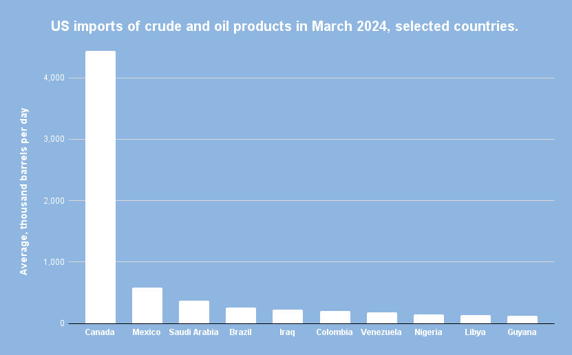 In March, Venezuela became the seventh-largest source of all oil products in the US, as well as the sixth if we only consider crude. EIA data.